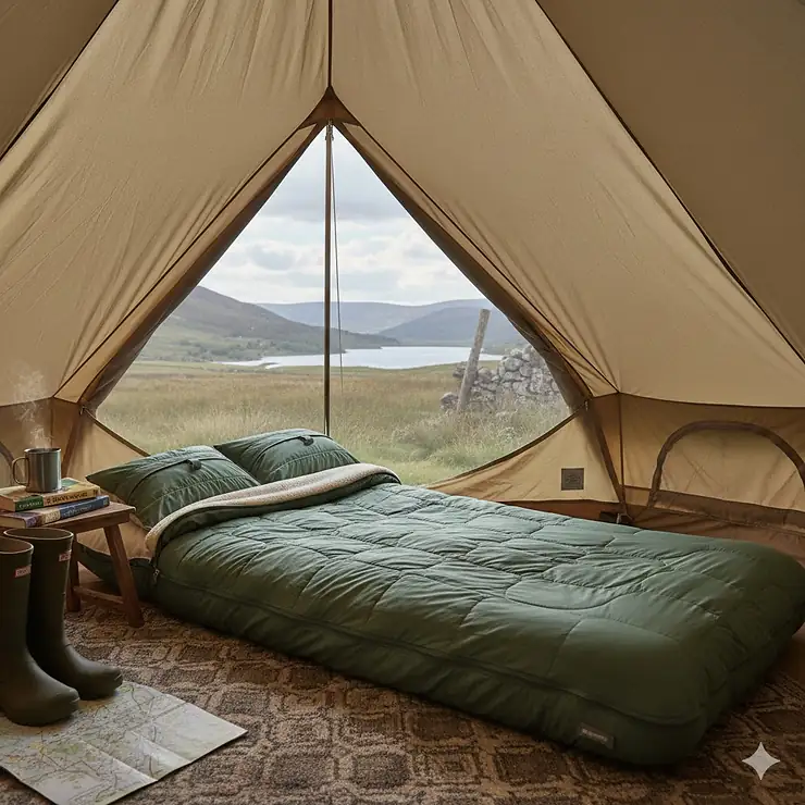 Double Sleeping Mats: The best double camping sleeping bag UK performs poorly without proper ground insulation. Self-inflating mats (R-value 3.0+) prevent 70% of heat loss through ground contact. Budget £40-80 for quality options from Thermarest, Sea to Summit, or Vango.